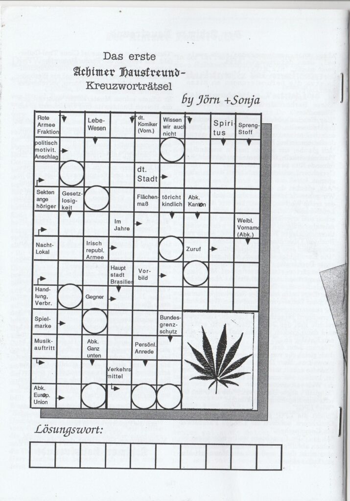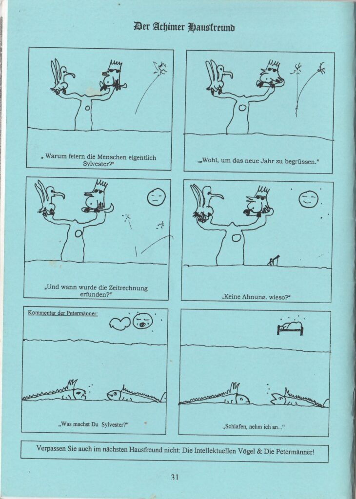 Der Achimer Hausfreund startete Mitte/Ende 1995 als 12seitiges Heft in 100er-Auflage. Layoutet wurde in der Badener Poststraße ansässigen Factory an Hagen van Beecks MacIntosh. Am Tag darauf ging es in den Copyshop. Zu finden waren die kostenlosen Exemplare in hiesigen Geschäften und Veranstaltungsorten (z.B. dem Kulturhaus Alter Schützenhof), und wurden verschickt an befreundete Menschen.